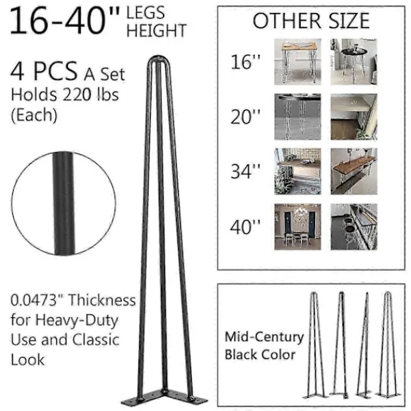 PREMIUMKVALITET – Antal: 4 st; Färg: Svart; Benhöjd: 40 cm; Rörtjocklek: 0,0473″. Det 40 cm långa hårnålsbordsbenet är tillverkat av kolstål och har en robust design med tre stänger för stabilitet. Det är rostfritt och har en slät yta med pulverlackering. * HÖG KAPACITET – Var och en av de 40 cm långa bordsbenen kan hålla Max. 100 kg last. En uppsättning med fyra ben kan stabilt stödja bordsskivan och övre enheter upp till 400 kg. Den är robust och kan bilda ett robust bord, bänk eller stol. * GOLVSKYDDANDE DESIGN – Fyra gummiskydd ingår i paketet. Använd dem för att skydda golv från repor eller som en extra stabilisator för möblerna. Våra hårnålsbordsben är lätta att rengöra med vatten, vilket är ganska arbetsbesparande. * SNABB OCH ENKEL INSTALLATION – Monteringsplattan på 4,3″x4,3″ har fyra 6 mm förborrade hål och matchande skruvar. Du kan använda en automatisk skruvdragare för att fästa skruvarna och benen i träplattan. Så installationen är snabb och problemfri för alla nivåer! * MÅNGSIDIGA ANVÄNDNINGSOMRÅDEN – Våra svarta hårnålsbordsben är det perfekta sättet att skapa ett soffbord, sidobord, nattduksbord, bänk, matbord, skrivbord, stolar etc. Ge dina möbler ett elegant och modernt rustikt utseende. ************************************************************************************************************** *Specifikationer Antal: 4 st Bordsbenhöjd: 16″ / 40,6 cm Material: Kolstål Rörtjocklek: 0,0473″ / 1,2 mm Rördiameter: 0,39″ / 10 mm Lastkapacitet (vardera): 220 lbs / 100 kg Monteringsplatta: 4,3×4,3″ / 11×11 cm (L x B) Produktvikt (vardera): 0,88 lbs / 0,4 kg ***************************************************************************************************************************** *Paketinnehåll 4 x hårnålsbordsben 4 x gummifötter för golv 1 x skruvsats