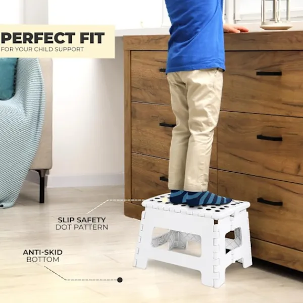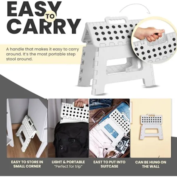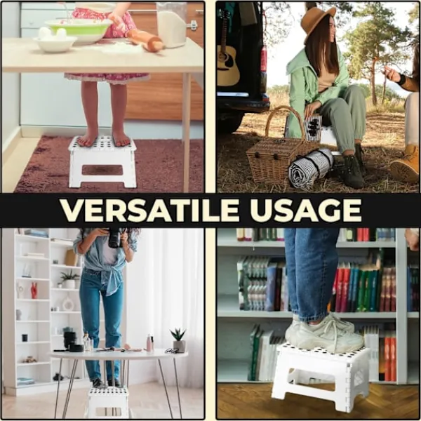 Halkfri Yta – Med en halkfri och texturerad yta kan du säga adjö till vobbling och säkerställa extra grepp. Använd den hopfällbara pallen med självförtroende, med vetskapen om att den alltid är säker.