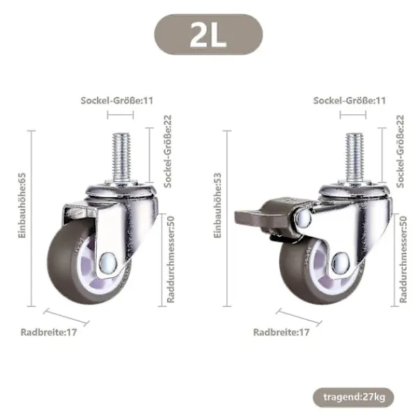 Fästskruvens stångdiameter: 10 mm, längd 25 mm. Den totala lastkapaciteten för dessa 4 möbelhjul med bromsar är 108 kg, 27 kg per hjul. Hjulen har en diameter på 50 mm, hjulens bredd är 17 mm och den totala höjden är 65 mm. Transporthjulen kan användas både inomhus och utomhus. Hjulen är lämpliga för gräs, trägolv, kakelunderlag, mattor etc. De rullar tyst och skadar inte underlaget. Dessa hjul används som pallar för möbler och som kraftiga hjul inom industrin. Hjul med bromsar är mångsidiga och kan även användas som hjul för strandstolar eller parasollfötter.