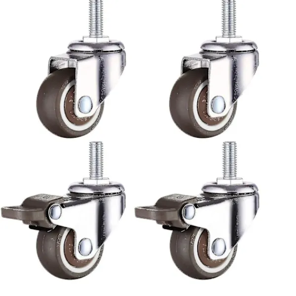Fästskruvstångens diameter: 10 mm, längd 25 mm. Den totala belastningskapaciteten för dessa 4 möbelhjul med bromsar är 108 kg, 27 kg per hjul. Hjulens diameter är 50 mm, hjulens bredd är 17 mm och den totala höjden är 65 mm. Transporthjulen kan användas inomhus och utomhus. Hjulen är lämpliga för gräs, trägolv, kaklade underlag, mattor etc. De rullar tyst och skadar inte underlaget. Dessa hjul används som pallar för möbler och som tunga hjul inom industrin. Hjul med bromsar är mångsidiga och kan även användas som hjul för strandstolar eller parasollstativ utomhus.