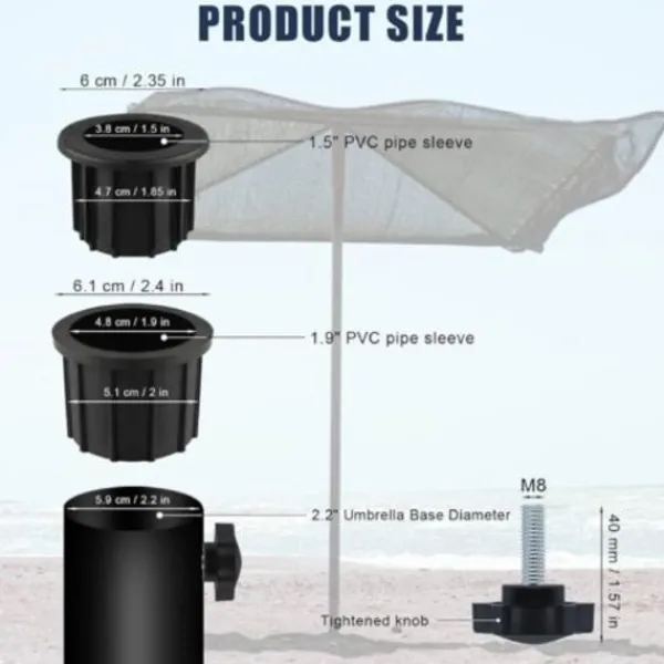 Beskrivning Färg: Svart Material: Plast, Rostfritt stål Produktstorlek: Som visas på den detaljerade bilden Paketdetaljer: 2 set (4 st) x Paraplyhålsring 2 x Handknoppskruvar Obs: Två paraplybasrörshylsor i 2 storlekar kan passa ihop och kan separeras för hand. På grund av manuell mätning kan storlek och vikt ha vissa fel. På grund av skillnaden mellan bildskärmar kan det finnas en liten färgskillnad.—qudd_RUFC-1017