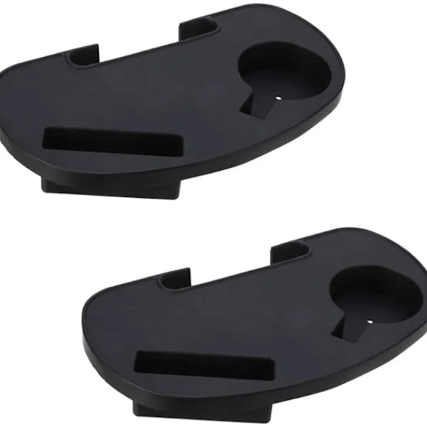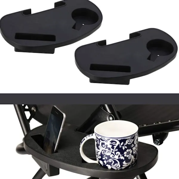 Fastsättningsbara mugghållare: Detta set med två fastsättningsbara mugghållare är det perfekta tillskottet till din campingstol. Den utgör ett praktiskt bord som inkluderar en mugghållare och en telefonbricka. Den är utformad för att passa de flesta utomhusstolar och vilstolar med en rund rörformad ram. Observera att den inte är lämplig för stolar med fyrkantig rörram.