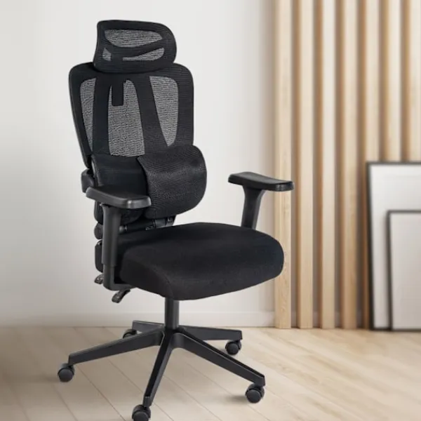 Ergonomisk kontorsstol. Upplev extraordinär sittkomfort och otaliga ergonomiska funktioner med denna kontorsstol, lämplig för kontor, skrivbord och hem på arbetsplatsen. Ryggstödet erbjuder ett bekvämt ländryggstöd och ett höjd -justerbart nackstöd. Dessutom kan ledstången lutas och låsas för maximal komfort upp till 135 grader. Armstödet lindrar nack- och axeldelen och är justerbara i tre riktningar (höjd, framåt/bakåt, roterbar) .. ryggstödet är täckt med ett höglättande och andningsbart nätmaterial, vilket gör svängbar målet bekvämt, även på sommardagar. Med den högkvalitativa gaslyftningen är den rotlösa i höjd justerbar. Den mycket robusta ramen med flexibla hjul säkerställer en stabil position. Den maximala lastkapaciteten är 135 kg .. Detaljer:. Total bredd: 67 cm. Total höjd: 117 – 125 cm. Höjd med lutat rygg: 107 – 115 cm. Totalt djup: 52 cm. Djup med lutat rygg: 89 cm. Sitshöjd: 47 – 55 cm. Sätet (B X D): 52 x 43 cm. Höjd ryggstöd: 55 cm. Höjd rygg med nackstöd: 70 cm. Höjdarmstöd: 68 – 76 cm. Max. Skattebildbarhet: 135 kg. Vikt: 14 kg. Materialkomposition: 100% polyester. Session:. Klädsel: Hållbart tyg. Ryggstöd med högt och andningsbart nätverk. Med höjdjusterbar nackstöd, ländryggstöd och 3D-armstöd. Ryggstöd kan lutas och låsas upp till 135 grader. Chassi:. Material: Plast. Höjdjusterbar och roterbar