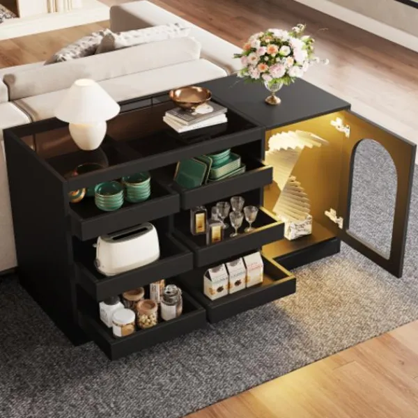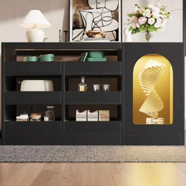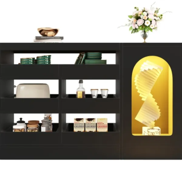 Krocksäkerhet och säkerhetsdesign: Skåpet kan utrustas med en tippskyddsanordning för att förhindra tippning och skakning. Det är särskilt lämpligt för familjer med barn eller husdjur för att öka säkerheten vid användning. Utrustad med LED-ljusslingor som dekoration kan den skapa en varm och unik atmosfär, öka skänkens utseende och göra den till en höjdpunkt i vardagsrummet.