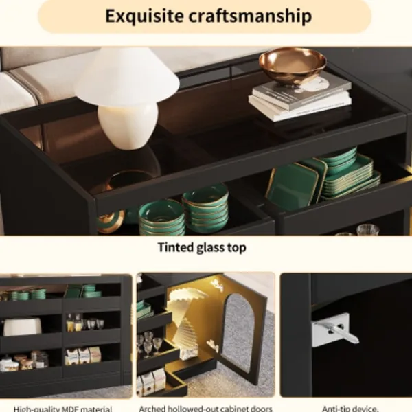 Utmärkt design: Ovansidan är gjord av färgat glas, vilket inte bara är vackert och stilrent, utan ger även skänken ett modernt och sofistikerat utseende och gör det enkelt att transportera och organisera. Den unika bågformade designen på skåpdörren med ihåliga stänger bryter monotonin hos konventionella skåp och är extremt konstnärlig och designorienterad. Tack vare sin ihåliga design kan föremål ställas ut i den.
