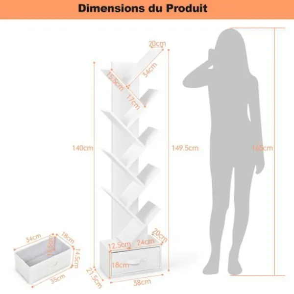 Material: Välkonstruerat trä, tyg Totala mått: 38 x 21,5 x 149,5 cm (L x B x H) Mått på lådan: 35 x 18 x 14,5 cm (L x B x H) Lastkapacitet per hylla: 2,5 kg Den unika trädformen kombinerar smart praktisk användning och estetik Anti-tippanordning säkerställer god stabilitet Halkfria tassar skyddar golvet från repor