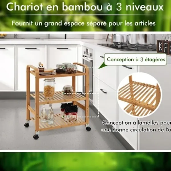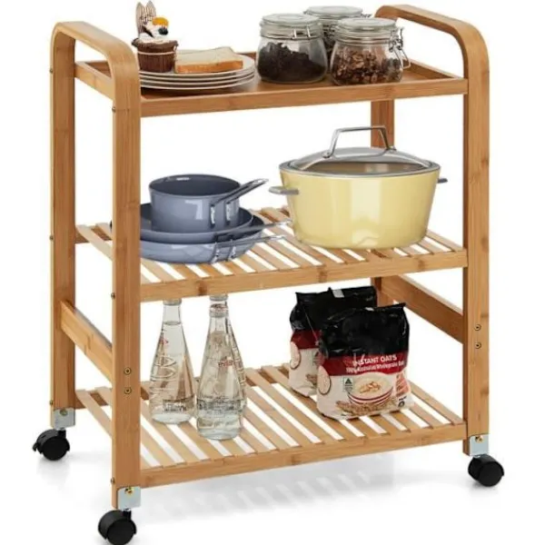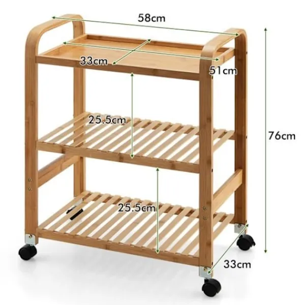 Material: Bambu Produktdimensioner: 58 x 33 x 76 cm (L x b x h) Hyllstorlek: 51 x 33 cm (L x b) Maxvikt per hylla: 20 kg 4 flexibla hjul (2 låsbara) för enkel flytt och fastsättning Avtagbara hjul för att möta olika behov Hyllor med ribbor är mindre benägna att samla vatten 2 släta handtag för att skjuta och dra köksvagnen