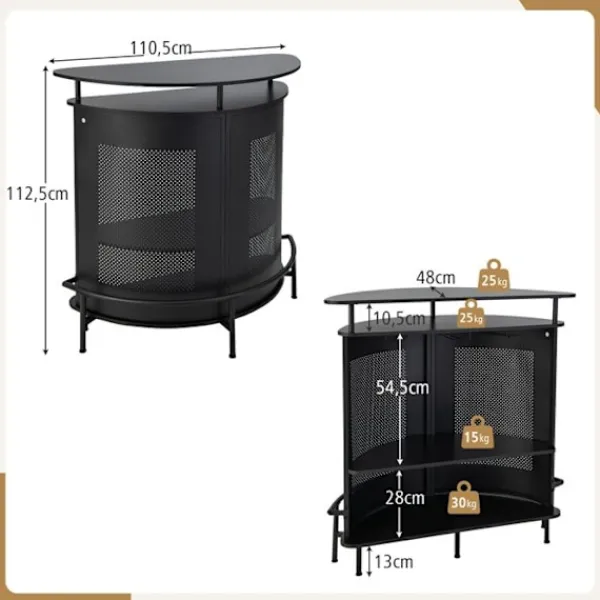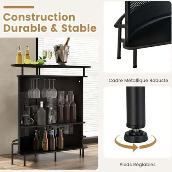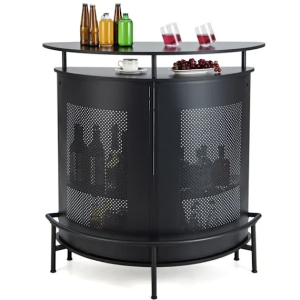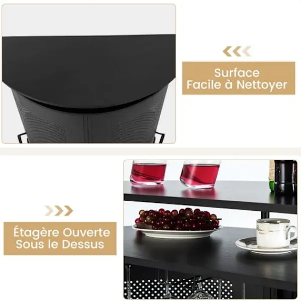 >1 kurvad arbetsyta, 1 öppen hylla under ytan, 2 hyllor och 3 fotglasstöd för ett stort förvaringsutrymme