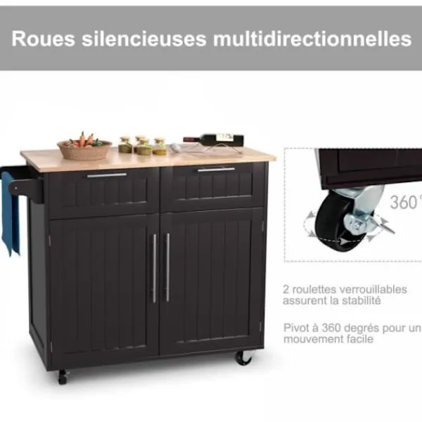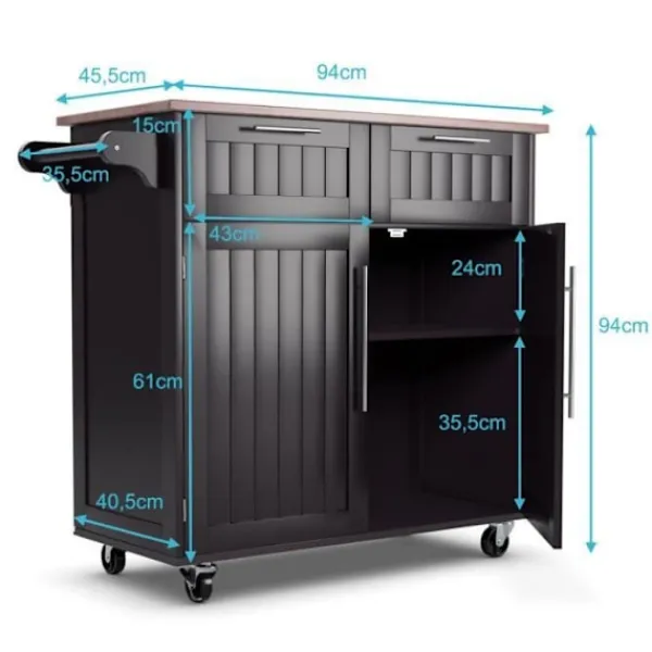 Tillverkad av högkvalitativt furu och gummiträ för ökad hållbarhet 4 universella hjul (2 låsbara) för enkel förflyttning och fastsättning 2 djupa lådor och 2 stora skåp erbjuder gott om förvaringsutrymme Justerbar hylla i 3 positioner för att möta olika användningsbehov Perfekt för kök, matsal, bar Totala dimensioner: 94 x 45 x 94,5 cm (L x B x H)
