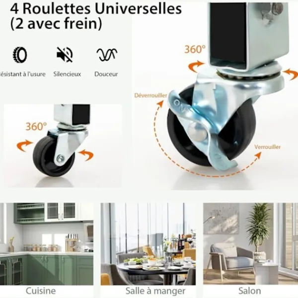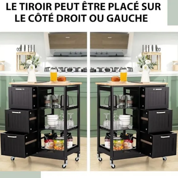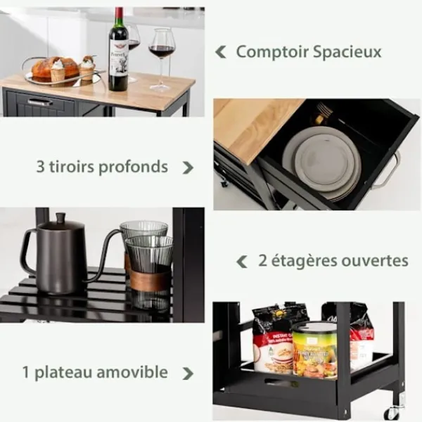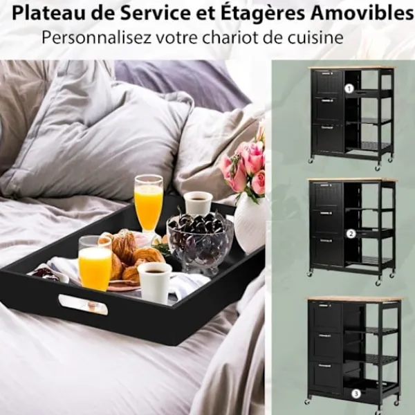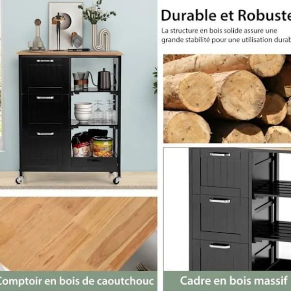 >Lätt att komma åt föremål på öppna hyllor >Bekvämt att flytta vagnen med 4 360° universalhjul >2 låsbara hjul säkerställer stor stabilitet när de står stilla >Stor disk, 3 lådor, 1 bricka och 2 hyllor för behov >Lamellhyllor för utmärkt ventilation > Låda, serveringsbricka och öppna hyllor kan placeras i olika positioner >Uttagbar serveringsbricka med handtag för att bära drycker och snacks >Tjock bänk av gummiträ för hög hållbarhet >Kan användas som serveringsvagn, köksställ, display eller kaffemaskinställ >Vattentätt yta för enkel rengöring >Perfekt för kök, matsal, vardagsrum, bar, restaurang, etc. . >Enkel struktur och detaljerade instruktioner för enkel montering.