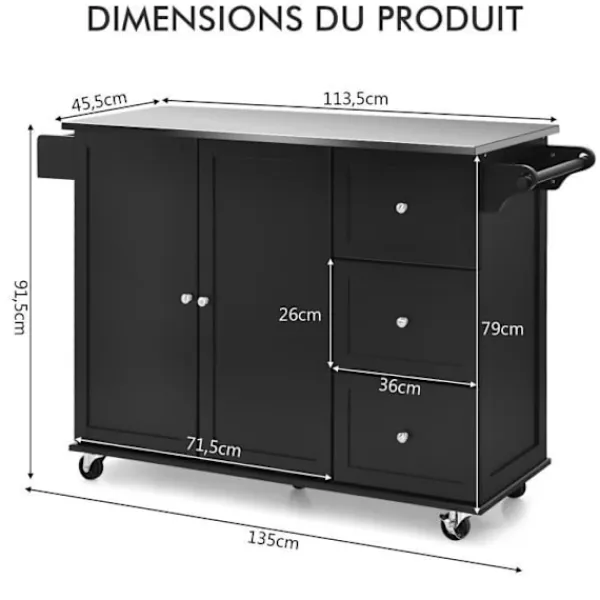 5 flexibla hjul (2 låsbara) för enkel flyttning och fixering – 3-läges justerbara hyllor för förvaring av föremål i olika storlekar – Handdukshängare kan användas som handtag – Bänkskivan i rostfritt stål är slitstark och lätt att rengöra – Lämplig för kök, matsal , restaurang, bar – Material: rostfritt stål, MDF – Mått: 135×45,5×91,5cm