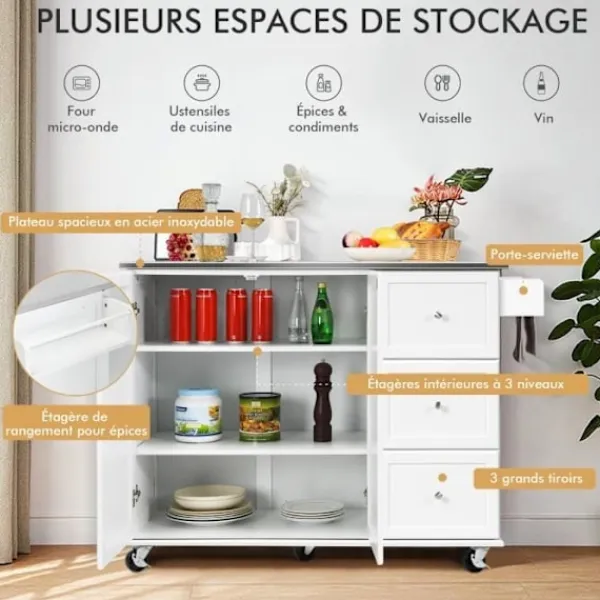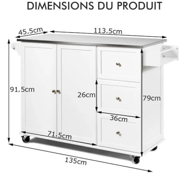5 flexibla hjul (2 låsbara) för enkel flyttning och fixering 3-läges justerbara hyllor för förvaring av föremål i olika storlekar Handdukshängare kan användas som handtag Bänkskivan i rostfritt stål är slitstark och lätt att rengöra Lämplig för kök, badrum, restaurang, bar Material: rostfritt stål, MDF Mått: 135×45,5×91,5