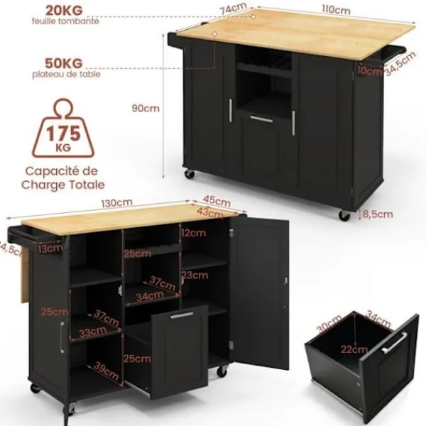 Den rullande köksvagnen COSTWAY är idealisk för smala kök. Den erbjuder gott om förvaringsutrymme med sina skåp, låda, vinställ och öppet skåp. Tillverkad av gummiträ, den är stark och hållbar. Hjulen är flexibla och låsbara för enkel rörelse och utmärkt stabilitet. Utplacerade mått: 130x74x90 cm.