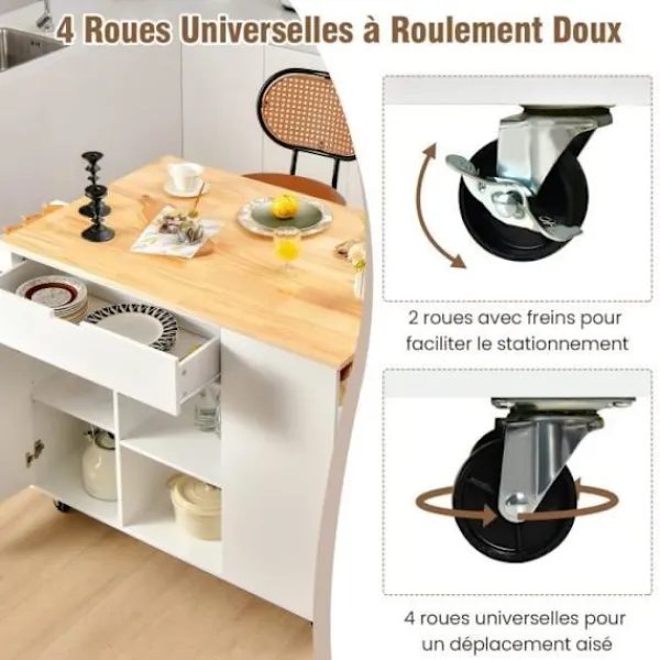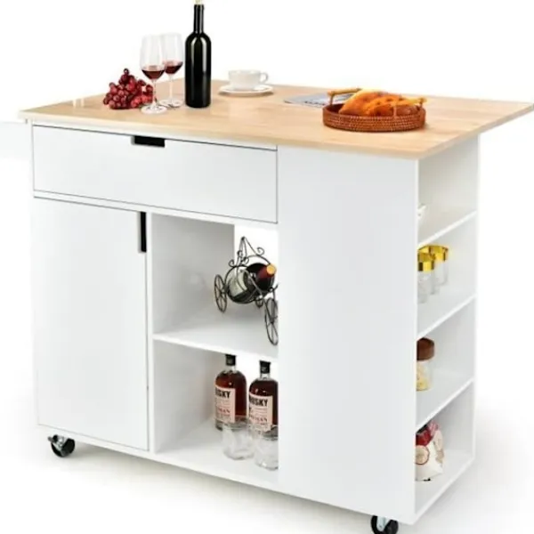Fällbordet med nedfallande blad gör det möjligt att utöka det extra utrymmet. Justerbara hyllor i 3 positioner i skåpet för att lagra föremål av olika höjder. 5 flexibla roterande hjul, varav 2 är låsbara. Kryddhylla på ena sidan för enkel åtkomst. Material: gummiträd, MDF, ingenjörsträ. Totala mått: 124x76x92 cm. Vikta mått: 124x43x92 cm.