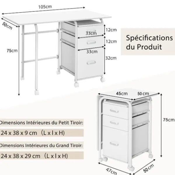 Material: MDF, Stål – Totala dimensioner: 105 x 50 x 74 cm (L x B x H) – Fällda dimensioner: 47 x 50 x 75 cm (L x B x H) – Utrustad med 6 hjul för enklare förflyttning (3 av dem är låsbara) – Multifunktionell skrivbord för sovrum, vardagsrum eller kontor – Max belastning: 100 kg