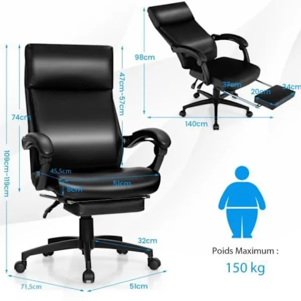 Ryggstödet justerbart från 105 till 145°. Den breda sitsen är fylld med svamp. Med 14″ infällbart nackstöd, armstöd och fotstöd. Den tysta kontorsstolen med universalhjul. Material: PVC-läder, Sydd läder. Sitsstorlek: 51×45,5 cm. Rygghöjd: 74 cm. Sitthöjd: 47-57 cm. Basens diameter: 32,4 cm. Nettovikt: 17,2 kg.