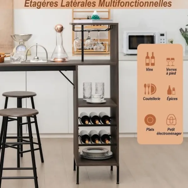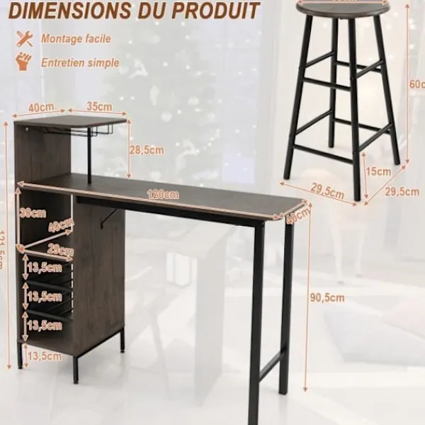 Dimensioner av höga bord för 2 till 4 personer Multifunktionella hyllor för att hänga upp vin glas, placera vinflaskor och andra diverse föremål Justerbara fotstöd anpassar till ojämn mark Triangelstruktur under bordsskivan förstärker också stabiliteten Barstool kan förvaras under bordsskivan Rund barstol + böjda bordben för säkerhet
