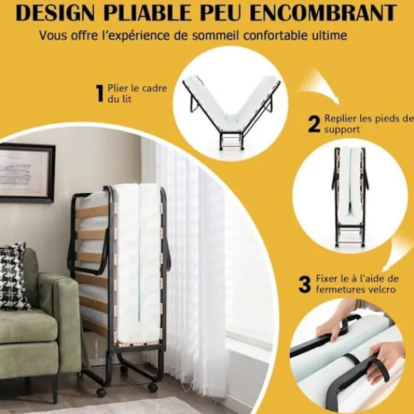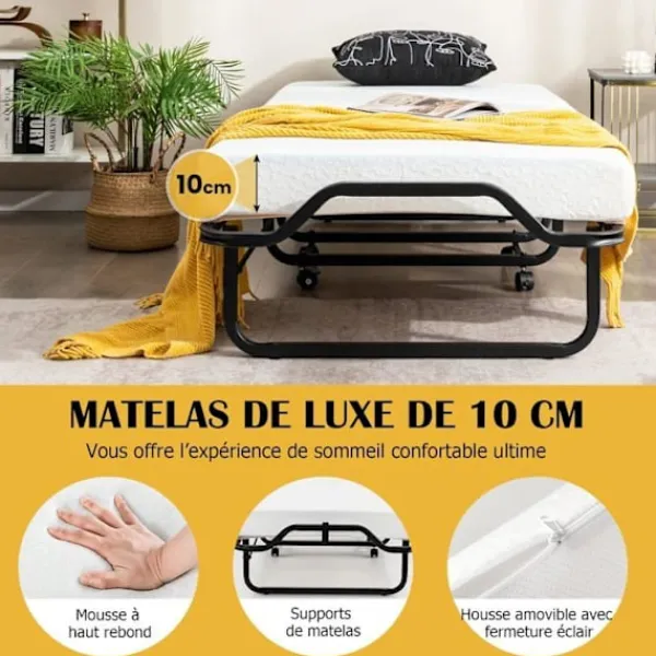 >Högdensitets skummadrass på 10 cm erbjuder den bästa komforten >Det avtagbara madrassfodralet är tvättbart i maskin >15 lister av massiv björk säkerställer bra bärförmåga >Material: Metall, Björk, Polyuretan, Polyester, PP >Uppfällbar sängramst Storlek: 199 x 78 x 37 cm >Mått i hopfälld läge: 78 x 32 x 111 cm >Madrassens storlek: 184 x 80 x 10 cm >Bärförmåga: 220 kg.