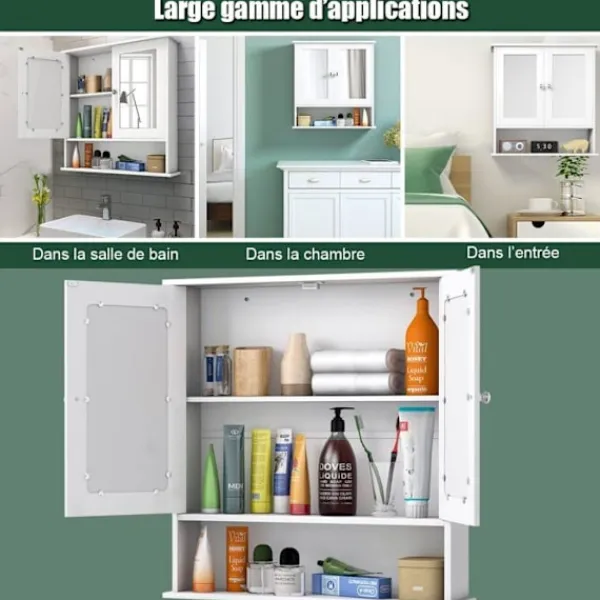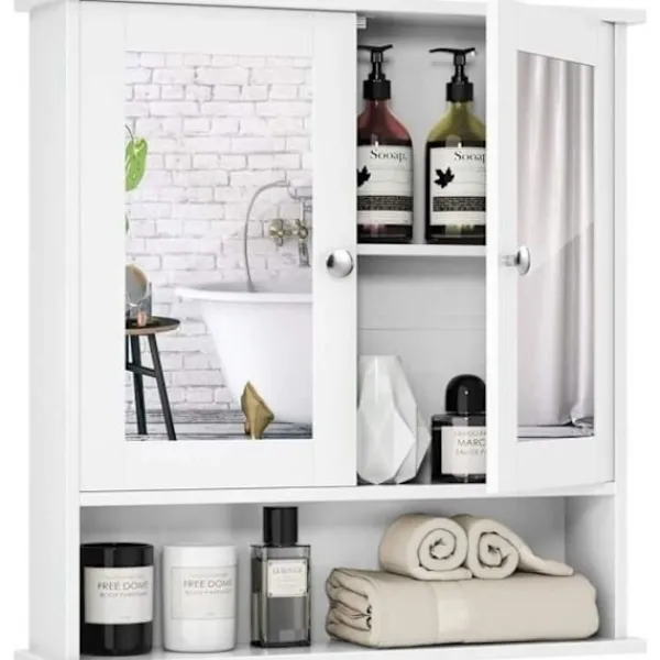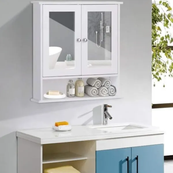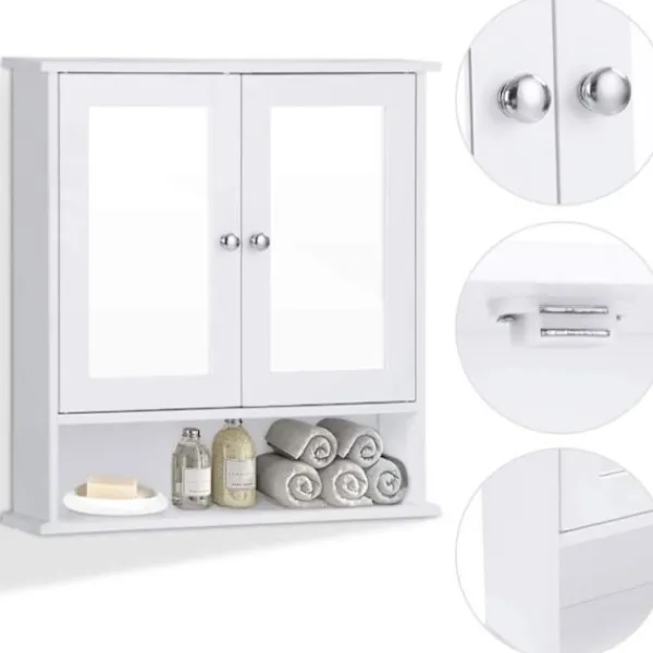 COSTWAY badrumsskåp är tillverkat av högkvalitativ MDF-skiva. Den är hållbar och robust. Praktiskt, den kan placeras i badrum, sovrum, vardagsrum eller kök. Den har 3 hyllor och 2 dörrar med spegel. Lätt att installera och rengöra. Mått: 56,5 x 13 x 58,5 cm. Vit färg.