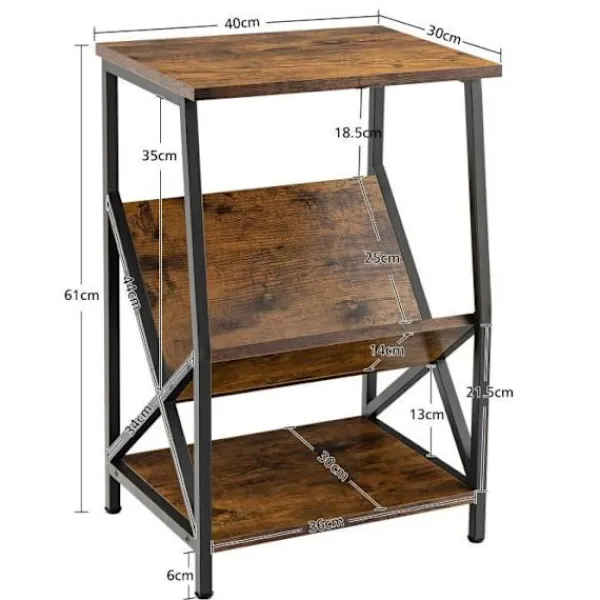 Mått: 40 x 30 x 61 cm, belastning 2025 kg per hylla Öppna hyllor ger gott om förvaringsutrymme ’V” för enkel förvaring av tidningar och böcker Enkel att installera, montering sker i 4 steg