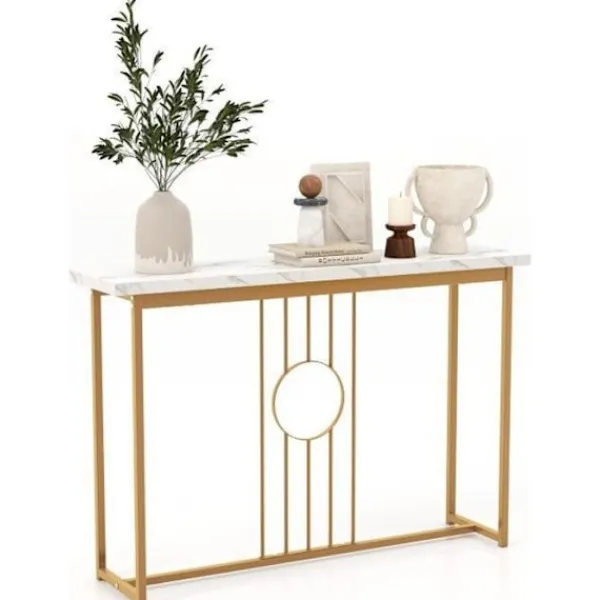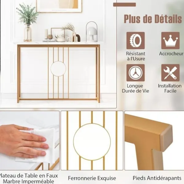 Vårt eleganta konsolbord i fuskmarmor är kompatibelt med olika hem- och inredningsstilar, vilket fungerar perfekt som entrébord, foajébord eller buffébord, etc. Den har justerbara glid och anti-lutningsanordningar för ökad stabilitet.