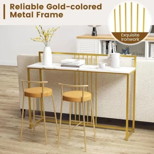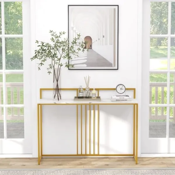 Denna COSTWAY-konsol består av en metallram i guld och en topp med marmortryck. Den är lämplig för vardagsrum, matsal eller entré. Fötterna har plastglidar för att skydda golvet. Brickans viktkapacitet är 20 kg. Mått: 120 x 32,5 x 88 cm (L x B x H).