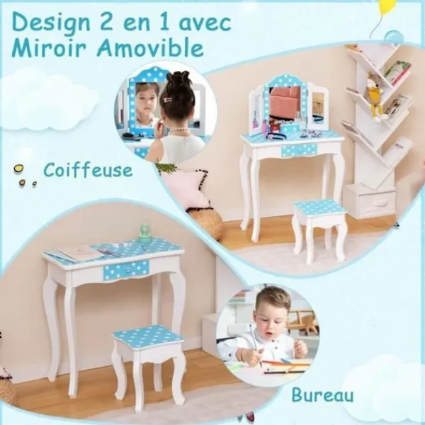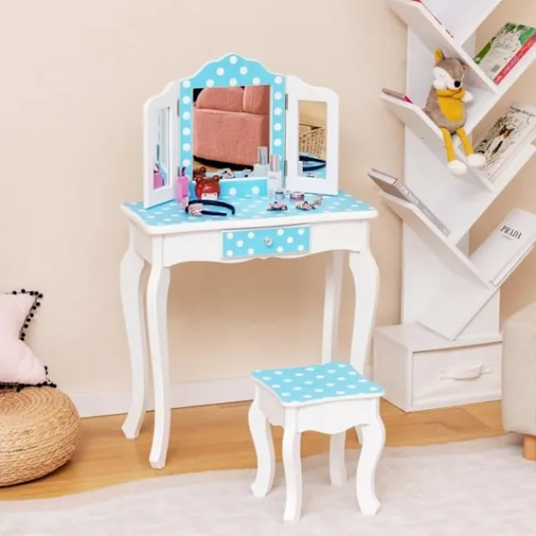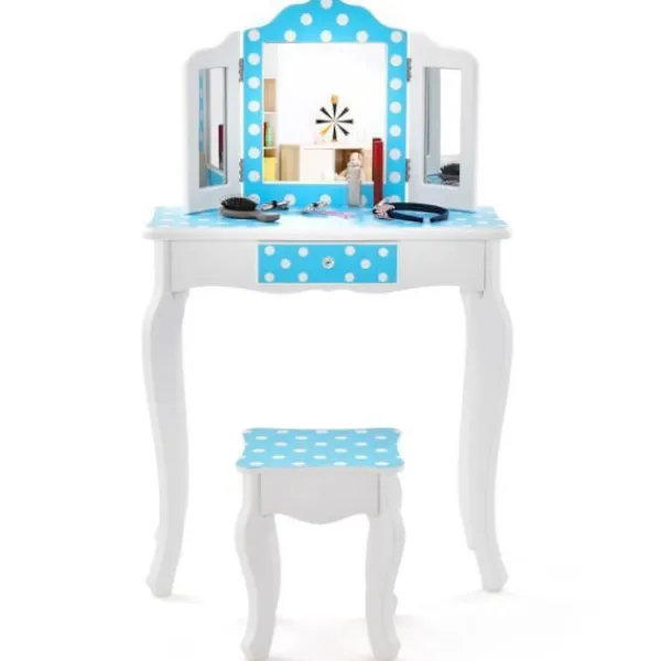 Detta sminkbord för barn kommer med en trippelvikbar spegel och matchande pall för att ge dem en trevlig smink- och påklädningsupplevelse. Den kan användas som skrivbord efter att spegeln tagits bort, för olika behov.