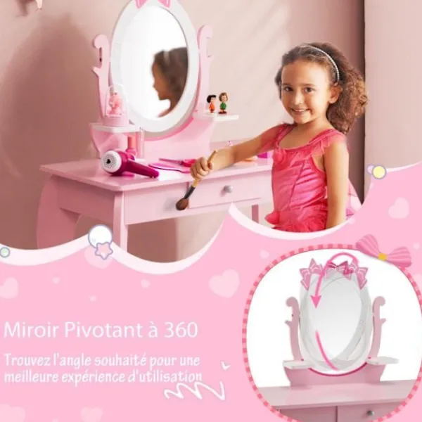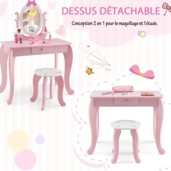 Spegling ovanpå bordet är avtagbar Rotera spegeln 360° för att enkelt hitta rätt vinkel 2-i-1 design kan användas som sminkbord eller studiebord Rundade hörn för ökad säkerhet när den används av barn Förstärkta böjda ben för god stabilitet Totala mått för bordet: 77x42x101 cm (L x B x H) Totala mått för pallen: 28x28x33 cm (L x B x H)