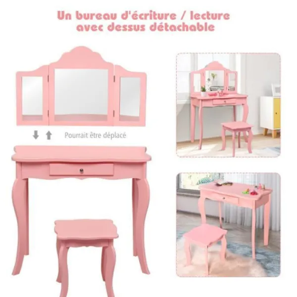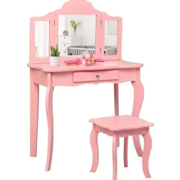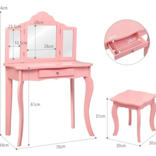 Vårt sminkbord med en lekfull prinsessdesign. Den tjocka och mycket motståndskraftiga kudden på pallen erbjuder bekväma sittplatser. En autentisk kvalitetsspegel kommer att reflektera perfekt. Perfekt att placera i ett barns sovrum eller lekrum. Vårt vita sminkbord och pall set är en perfekt present till små flickor. Lämplig för åldrarna 3-8.