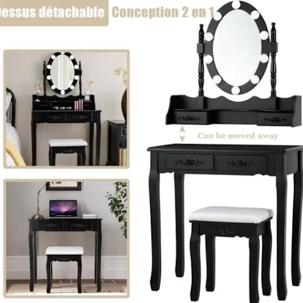 Ljusstyrkan och färgen på de 10 glödlamporna kan justeras efter behov >Antisklidkuddar för att undvika repor på golvet >Stolsitsarna är fyllda med kvalitets-skum för mer komfort och mjukhet >Det stora bordet samt 4 lådor erbjuder förvaringsutrymme >Material: MDF + Furu >Dimensioner för sminkbordet: 75x40x145 cm >Dimensioner för stolen: 37x28x45 cm >Bordets belastningskapacitet: 35 kg >Stolens belastningskapacitet: 100 kg