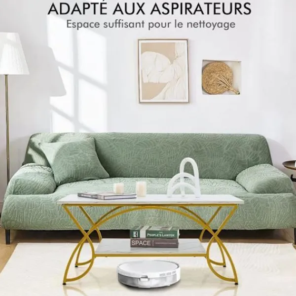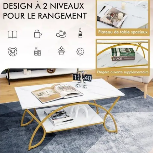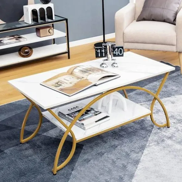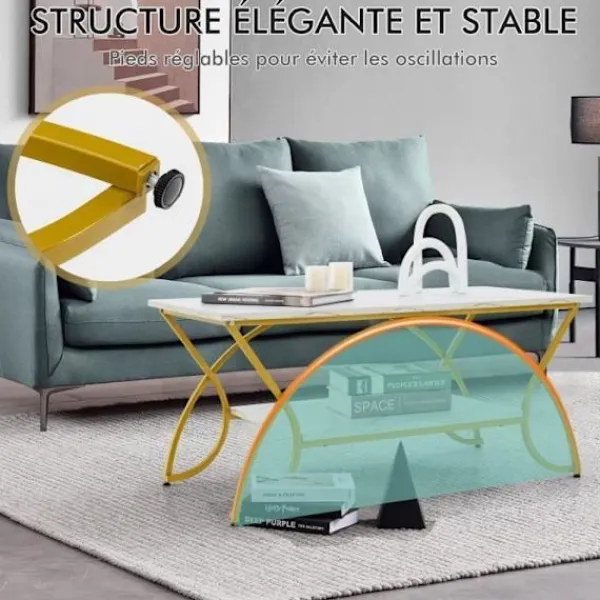 >Modern soffbord anpassar sig till olika inredningsstilar. >Skiva i falskt marmor kombinerad med en förfinad metallbas. >Design i 2 nivåer ger dig gott om förvaringsutrymme. >Justerbara fotkuddar för ökad stabilitet. >Slick och vattentålig yta för din dagliga rengöring.
