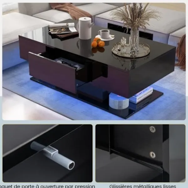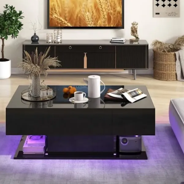 >Vibrerande omgivande belysning med justerbar färg och läge för en personlig show >Fjärrkontroll gör det enkelt att justera färg, läge, ljusstyrka och hastighet >LED-lampor kan anslutas till en powerbank eller ett uttag med USB-portar >Rymlig topp och öppen hylla perfekt visa vardagsrumsinredning >Push-open lådor med smidiga glider är lätta att öppna >Ger gott om förvaringsutrymme för fjärrkontroller, tidningar och snacks >Den blanka ytan ger en touch av värde och sofistikering >Lätt att torka bort smuts på den släta brickan med en mjuk trasa.