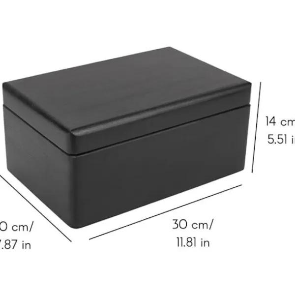 Denna stora svarta förvaringslåda i trä från Creative Deco är perfekt för att förvara och organisera alla dina dokument, värdesaker, kläder, smycken eller te. Med yttermått på 30 x 20 x 14 cm och innermått på 27,5 x 17,5 x 9,8 cm passar den för alla åldrar och kan anpassas efter dina behov.