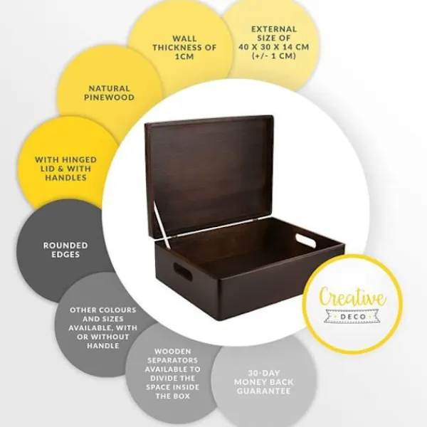 Denna förvaringslåda i massivt trä från Creative Deco är idealisk för att förvara och organisera alla dokument, värdesaker, leksaker, kläder, accessoarer och smycken. Med yttermått på 40 x 30 x 14 cm och innermått på 37,5 x 27,5 x 9,8 cm är den lätt och har en väggtjocklek på 1 cm samt en 3 mm plywoodbotten.