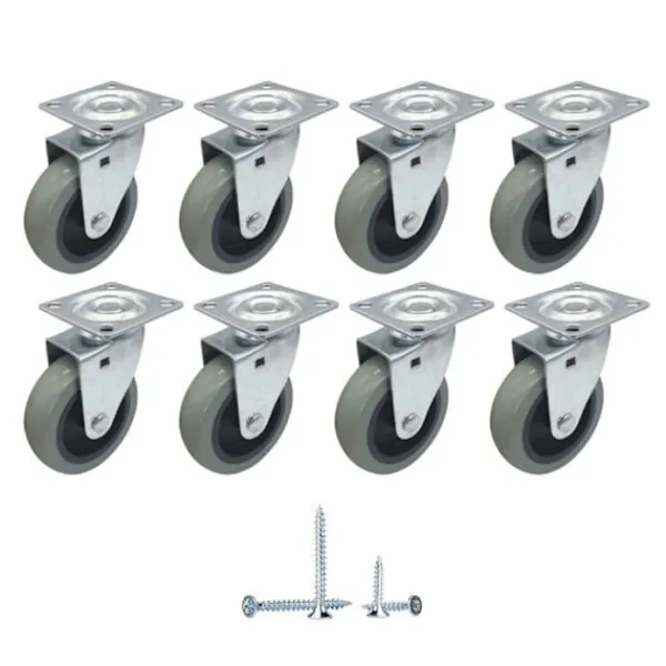 hjulen är gjorda av högkvalitativa material för att säkerställa hållbarhet, smidig och enkel rullning. hjulen ändrar riktning av sig själva och anpassar sig lätt till dina rörelser. enkel installation, inga speciella färdigheter krävs. De medföljande skruvarna passar hål som sitter i en metallmonteringsplatta (4 hål i varje monteringsplatta), så du behöver inte oroa dig för skruvkompatibilitet. Dessa svängbara hjul används för en mängd olika användningsområden, från gör-det-själv till industriella applikationer. lämplig för möbler, vagnar, transportlådor, papperskorgar, etc. förpackning: 8 hjul