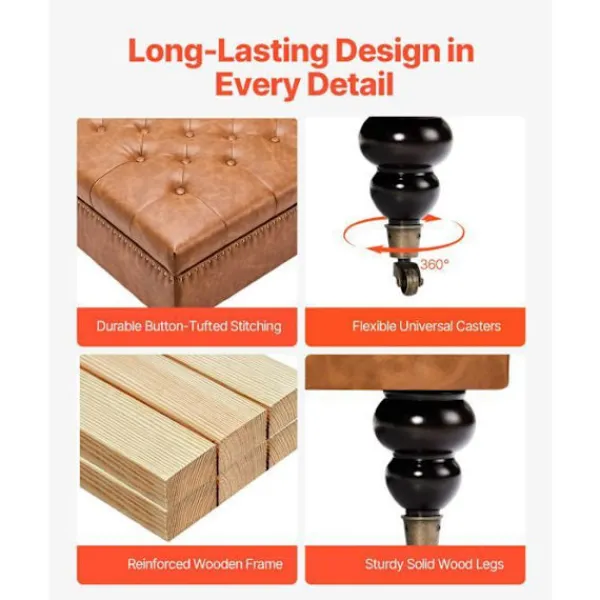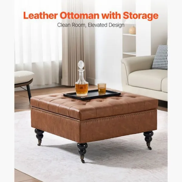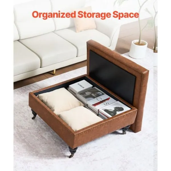 Denna fyrkantiga pouf i brun konstläder kombinerar komfort och funktionalitet. Med en integrerad förvaringslösning och fyra hjul är den lätt att flytta. Idealisk för vardagsrummet fungerar den både som fotpall och sidobord samtidigt som den optimerar ditt utrymme. Dess robusta struktur och eleganta design gör den till ett perfekt val för en modern inredning.