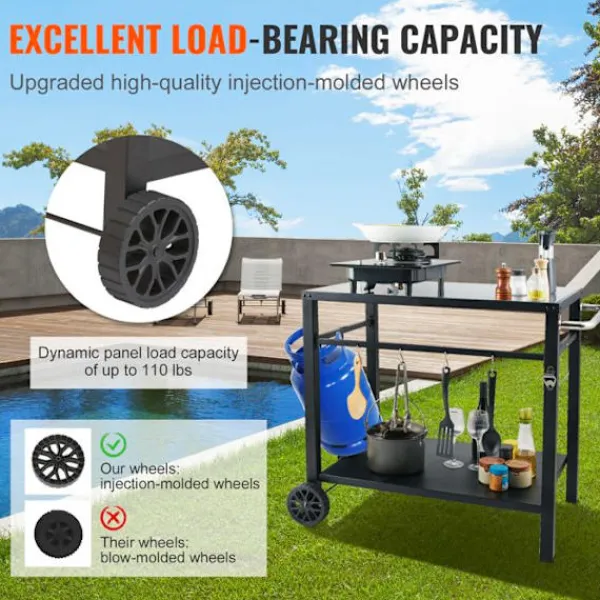 Mobil matvag för utomhusgrill, mått 1000 x 640 x 835 mm, vikt 11,85 kg. Idealisk för livsmedelsberedning, den har 2 hyllor och en bricka på 850 x 550 mm. Praktisk och elegant, den passar perfekt på din terrass.
