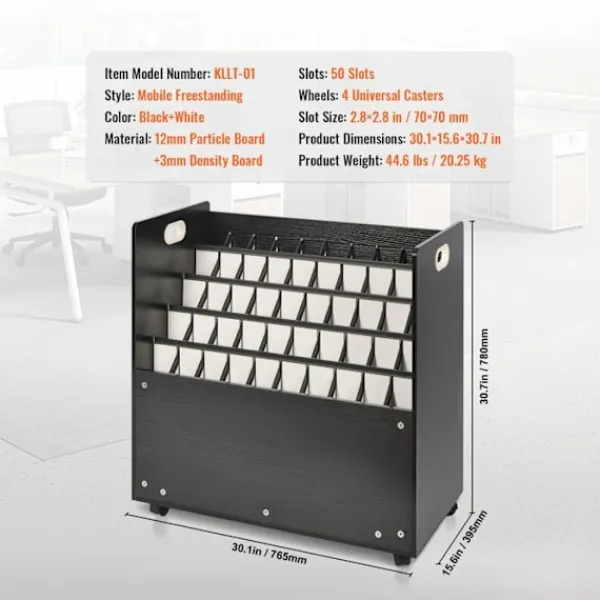 Produktvikt: 20,25 kg/44,6 lb >Produktdimensioner: 765 × 395 × 780 mm/29,7 × 15,6 × 30,7 in >Fackstorlek: 70 x 70 mm/2,8 x 2,8 in >Material: 12 mm spånskiva + 3 mm densitetsskiva >Hjul: 4 svängbara hjul >Fack: 50 fack >Stil: mobil och fristående >Färg: svart + vit >Artikelnummer: KLLT-01