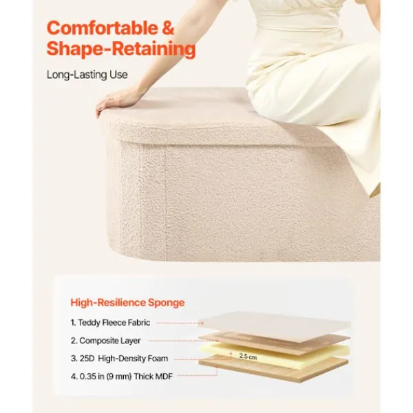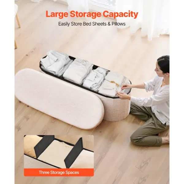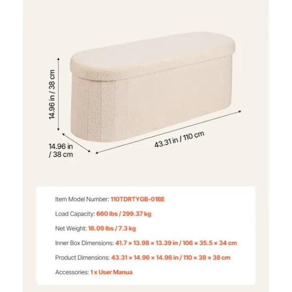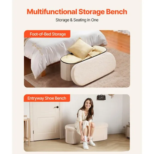 Den hopfällbara ovala förvaringsbänken från DUOKU är klädd i teddyfleece och klarar av upp till 299,37 kg. Med måtten 110 x 38 x 38 cm är den perfekt för vardagsrummet. Dess moderna design och beige färg passar enkelt in i ditt hem.