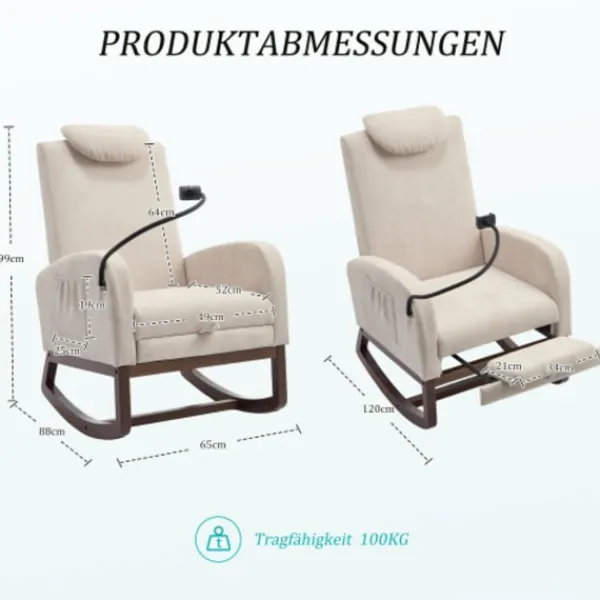 Multifunktionell gungstol – Oavsett om det är för att läsa, titta på TV eller koppla av: Denna vilstol kombinerar mild gungrörelse med funktionell komfort och kompletterar stilfullt alla vardagsrum, kontor eller personliga avkopplingshörnor.