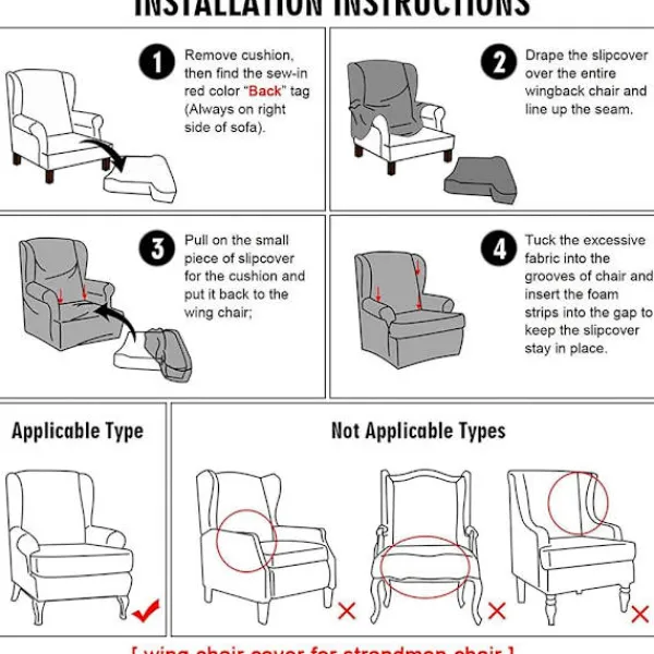 Material: 92 % polyester och 8 % spandex gör våra soffaöverdrag mer elastiska och hållbara, vilket säkerställer både god funktion och komfort. Skydda din nya fåtölj med vingar från daglig slitage, spill och fläckar, och ge din gamla fåtölj med vingar ett nytt, fräscht utseende istället för att köpa en helt ny. Passar perfekt: användbar för fåtöljer med vingar som är 69-80 cm långa, 95-110 cm höga och 80-92 cm breda. Den passar de flesta storlekar på fåtöljer med vingar. Du kan mäta din fåtölj med vingar i förväg och jämföra den med vår storleksguide. 1 x fåtöljöverdrag (ingen fåtölj). 2-delad design: Den här uppsättningen innehåller 1 fåtöljöverdrag 1 T-formad kuddeöverdrag. Elastiskt tyg som gör att de kan omsluta din fåtölj i en elegant form med enkel installation. För detaljerade installationsinstruktioner, se våra installationsinstruktioner på bilden eller kontakta oss gärna. Lätt att rengöra: Vårt fåtöljöverdrag är maskintvättbart. Tvätta separat på skonsamt program i kallt vatten. Använd inte blekmedel eller utsätt för solljus. Stryk på låg temperatur. Vårt fåtöljöverdrag är inte lätt att deformera. Tips: Med kort stil och attraktiva färger passar våra överdrag bra till dina mest olika möbler och inredningsstilar. På grund av olika ljus och bildskärmsvisning kan färgerna variera något från bilden och produkten, men var säker på att vi alltid gör vårt bästa för att minimera färgskillnaden så mycket som möjligt.