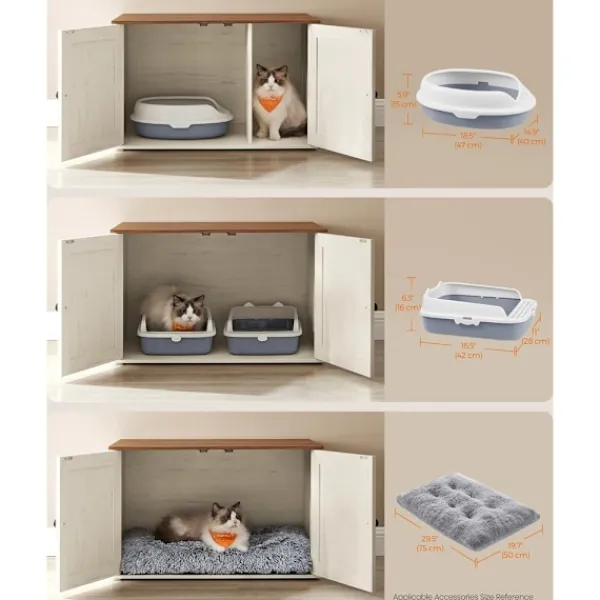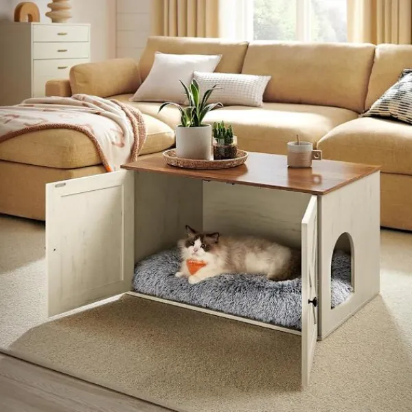 Den inre avdelaren kan tas bort för att skapa mer utrymme, antingen för en större kattlåda eller för att göra möbeln till en mysig kattsäng. Den stängda designen ger katten en privat plats för sina behov och minskar samtidigt lukt och spridning av sand.
