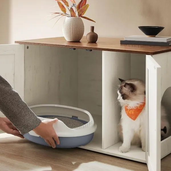 Med denna kattlådemöbel från Feandrea förvandlas kattlådan från ett störande inslag till en stilren del av inredningen. Den lantliga designen i honungsbrunt och vitt med dubbla dörrar gör att möbeln smälter in i hemmet och fungerar både som sidobord och som praktisk förvaringslösning.
