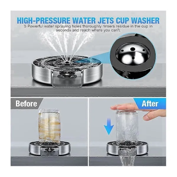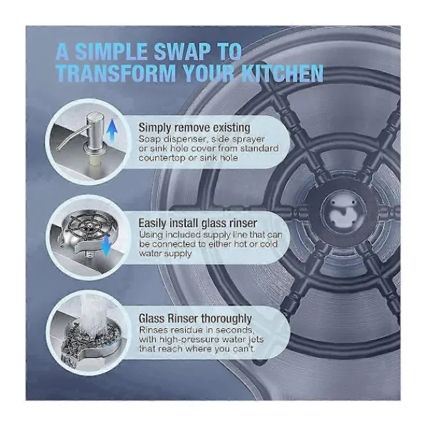 [Rostfri stålglasrengöringsborste] – Chassit och kroppen på glasrengöringsmaskinen är gjorda av rostfritt stål med elektropläterad yta. Det avtagbara 360° roterbara stativet är tillverkat av förtjockat silikonmaterial, som är värmebeständigt och icke-, vilket effektivt skyddar din kopp. [Tvättmaskinen sköljer bort rester på några sekunder] – Glasrengöraren fungerar med högt vattentryck. Den roterande vattenstrålen i flera vinklar sköljer noggrant bort rester på några sekunder, medan ett överhäng leder vattenflödet in i diskbänken för enkel rengöring. [Glasrengöraren når dit du inte kan] – Från nappflaskor till vinglas till resemuggar, den sköljer bekvämt alla dryckesredskap, så att du kan spendera mindre tid på att blötlägga och skrubba. Denna praktiska och praktiska sköljanordning ökar effektiviteten i den dagliga kopprengöringen. [Multifunktionell Diskbänkskopptvättare] – Diskbänkskopptvättaren rymmer tillräckligt med de flesta glas och koppar (med en diameter mindre än 3,94 tum av koppens mynning), såsom nappflaskor, kaffemuggar, vinglas, champagneglas, koppar, shakers, burkar, etc. [Lättanvänd babytvätt] – Tryck försiktigt på botten av koppen med mynningen nedåt och spraya automatiskt vatten för att rengöra. Efter rengöring, ta bort koppen och stoppa den automatiska vattensprayen. Det är också enkelt att installera: det tar bara 12-18 minuter att slutföra installationen.