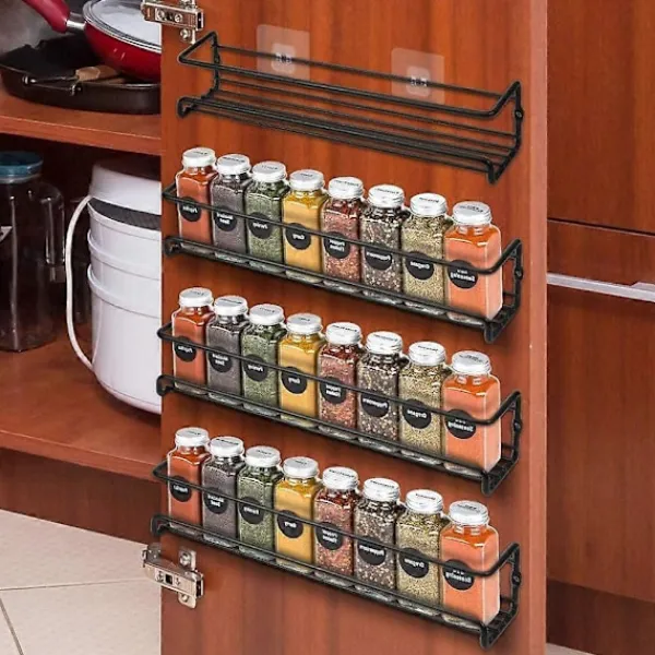 Bred tillämpning: Våra dörrmonterade kryddställ erbjuder en permanent lösning på förvaringsbehov och kan användas nästan överallt. Utmärkt som köksskåpens kryddställorganisatör, kryddhållare för insidan av skåpen i skafferiet eller säkert självhäftande kryddställ för köksväggar.