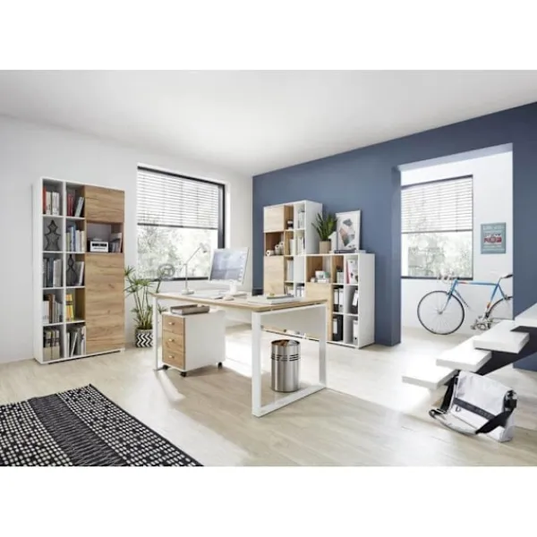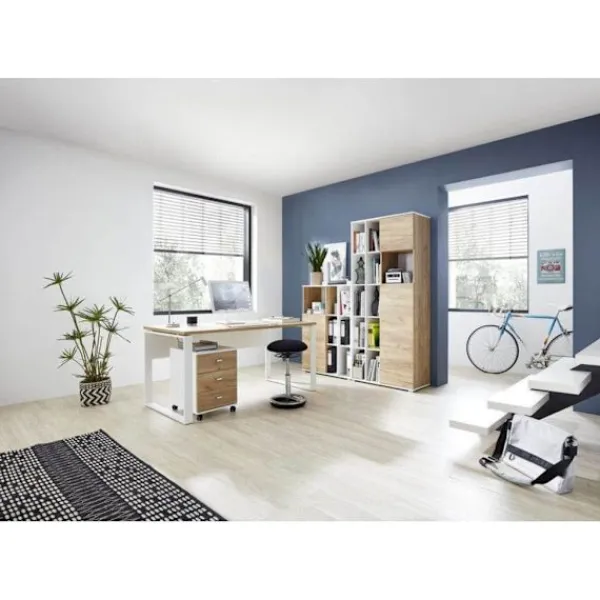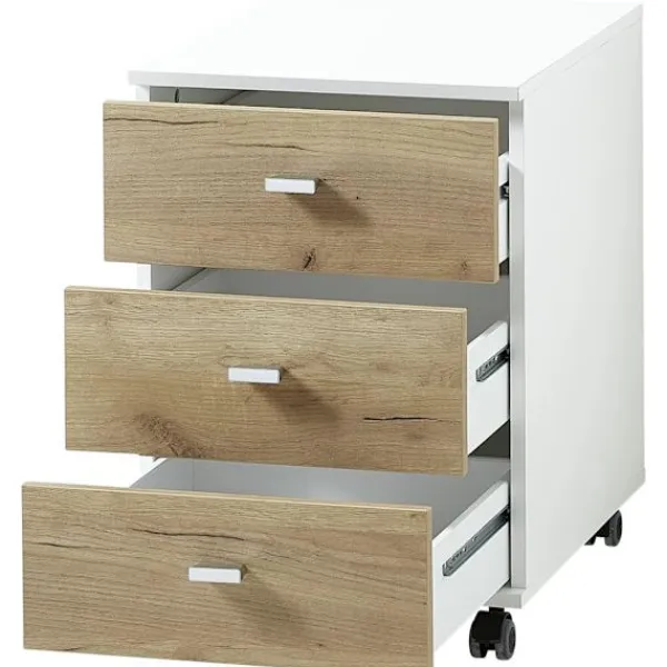 Med detta rullskåp, Altino från Germania, får du en vacker och praktisk möbel på ditt kontor som håller dina papper och filer organiserade och nära till hands. Den kompakta storleken gör den mycket utrymmesbesparande och de tre lådorna ger gott om förvaringsutrymme på arbetsplatsen. Den är lastbar upp till 5 kg. Tack vare sina fyra hjul, varav två med låsbroms, är den extremt flexibel. Detta rullskåp har en enkel design med modern färg i vitt och navarra-ek. Det imponerar oavsett om det är fristående eller kombineras med dina befintliga möbler.
