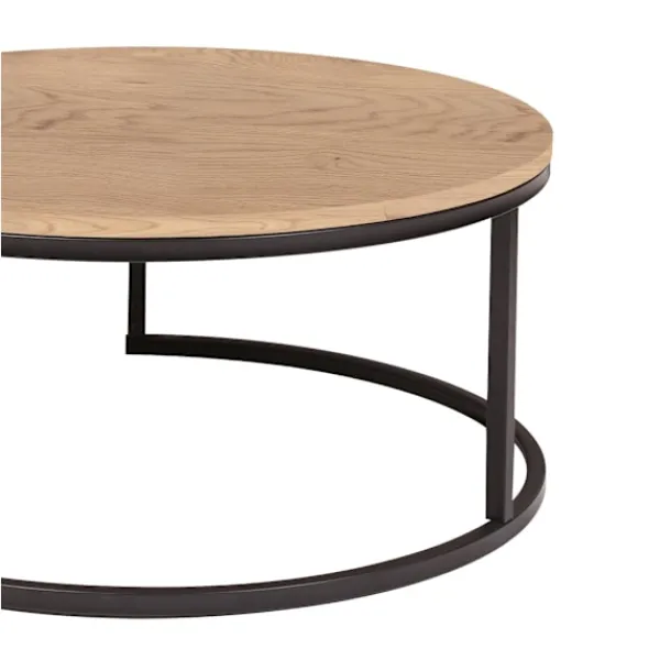 Soffbord BRITU D80xH35cm, ljust trä. Bordsskivans inredning ser ut som trä. Den är gjord av 18 mm MDF-skiva. De svarta metallbenen och basramen är pulverlackerade. Mått på bordet D80xH35cm.