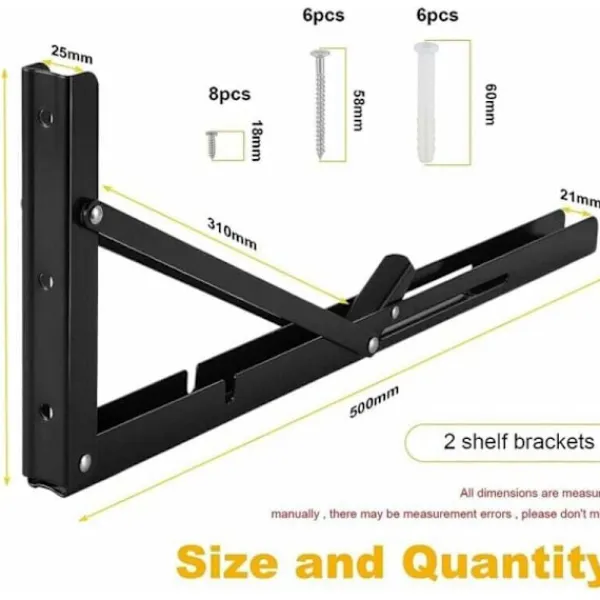 【Robust och slitstark】 Svart hopfällbar hyllkonsol är tillverkad av högkvalitativt rostfritt stål, tål dagliga repor och korrosion och behåller en ny glans. 【Platsbesparande】 Väggmonterade hopfällbara hyllkonsoler kan låsas i 90 grader. När du vill fälla ihop bordet trycker du bara på avlastningsarmen. Utmärkt prestanda, lämplig för trånga utrymmen, hjälper till att hålla ditt rum städat. 【Lätt att installera】 Hopfällbara hyllkonsoler kan installeras på alla typer av väggar utan att skada väggen. Du behöver bara se till att de två hopfällbara vägghyllorna är parallella med varandra och vinkelräta mot väggen. Du kan bygga en hopfällbar hyllkonsol eller ett litet väggmonterat hopfällbart skrivbord för ditt hem eller garage. 【Storlek och förpackning】 Svarta hopfällbara konsoler 50 x 17 cm (20 x 6,7 tum), komplett med monteringstillbehör, högkvalitativa skruvar i rostfritt stål och högkvalitativa väggpluggar, så du behöver inte köpa annan hårdvara och delar för att installera den. 【Används i stor utsträckning】 Svarta hopfällbara konsoler är perfekta för många hemförbättringsprojekt. Perfekt för butiker, husbilar, camping, bakgårdar, sovrum, kök, balkonger, badrum etc. Väggmonterade hopfällbara konsoler som kan användas som skrivbord, väggmonterat hopfällbart bord, kökshylla, väggmonterad arbetsbänk, trädgårdshylla, utomhusväggfäste etc.