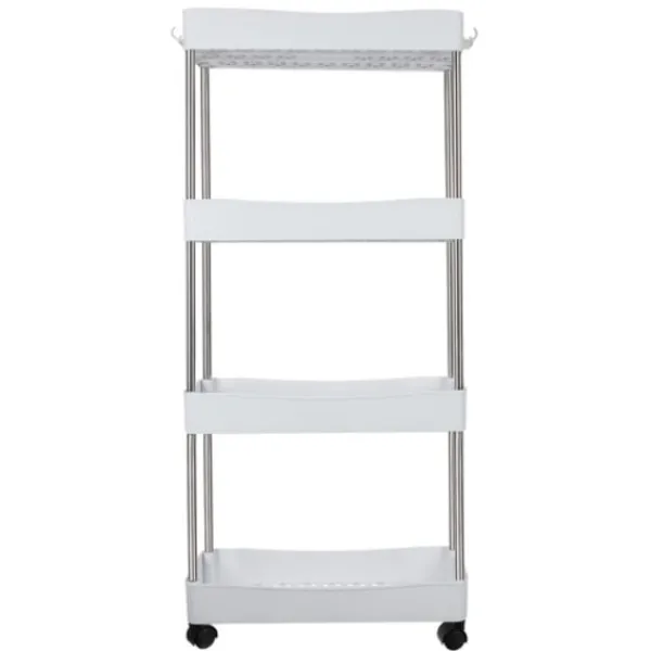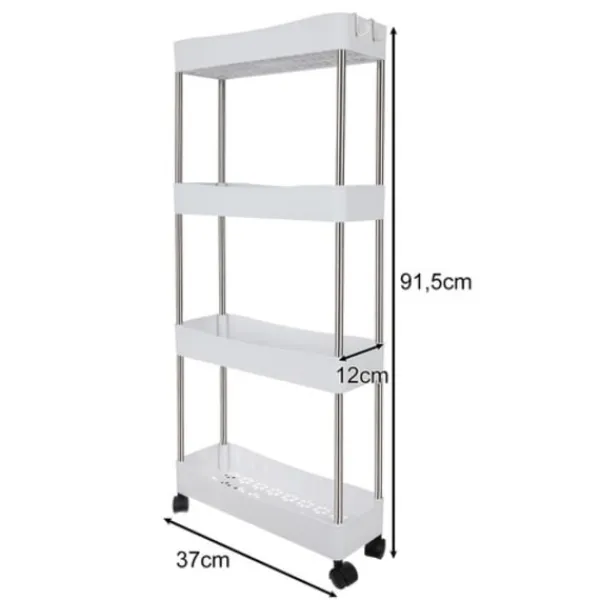 Denna mobila hylla är perfekt för att organisera kosmetika, städmaterial, handdukar eller badtillbehör i badrummet. I köket fungerar den som extra förvaring för kryddor, små apparater och redskap. Den kan också användas på kontor för att organisera dokument och förnödenheter, i tvättstugor för tvättmedel, eller i garage och verkstäder för verktyg och material.