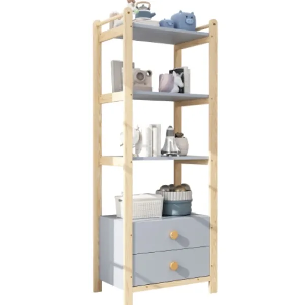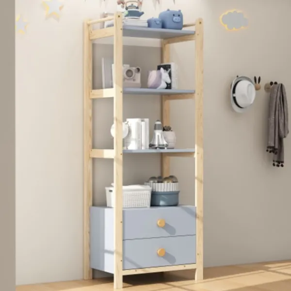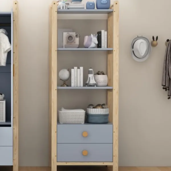 2. Naturlig materialmix: Fururam (robust), blå hyllor (gjorda av robust spånskiva) + handtag i massivt trä (bekväma att greppa) – kombinerar träets värme med en modern blå-trä kontrast.